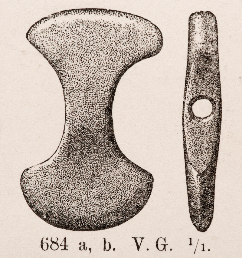 On the 29 September last year I wrote a blog post about the small bone bead found at the Alvastra pile dwelling. I said that I knew of no parallels to this bead. Before making such a statement one should always check Oscar Montelius’ book Minnen från vår forntid from 1917 (Montelius 1917, fig. 684.) Many of the classic artifacts in Stone Age collections known at this time are depicted there. I had not done this. It was not until I recently re-read Gunborg O. Janzons monograph on the dolmen in Alvastra that I discovered a parallel to the Alvastra pile-dwelling bead from a megalith in the Falbygden area. A bone bead in the shape of a double-edged axe was found in ancient monument 7 (Raä 7) in Falköping. This megalith, Frugården, is a passage grave. The bead belongs to a large collection of objects bought from Verner Hilder by the Museum of National Antiquities, now the Swedish History Museum, in 1872. It is c. 29 mm long and 19 mm wide, thus a little bigger than the Alvastra bead which is 23 x 15 mm. The Falbygden bead is also in one piece, unlike the bead from Alvastra which was found in two parts in two different excavation squares. Connections between the Falbygden area and the Alvastra area have previously been discussed by many archaeologists. This broken bead can form a further link in that discussion.