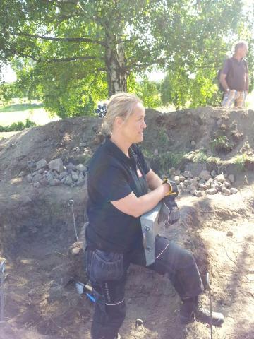 Under dagen har vi fortsatt att arbeta med fyllningen från Stolpes gamla schakt och fortfarande är det helt tomt på fyndfronten. Men vi är nöjda ändå eftersom vi har en ganska bra uppfattning om hur schaktet faktiskt såg ut. Vi kan ana vissa skiftningar i jorden där kanten till den gamla nedgrävningen – och även själva träkammarens väggar – kanske varit belägna. Vi jobbar hårt med att försöka komma ned till botten av kammargraven, som enligt de gamla planerna ska finnas på ungefär 2,5 meters djup. Från vilken nivå de 2,5 meterna är mätta är tyvärr lite oklart så som ni säkert förstår är det en ganska klurig uppgift.