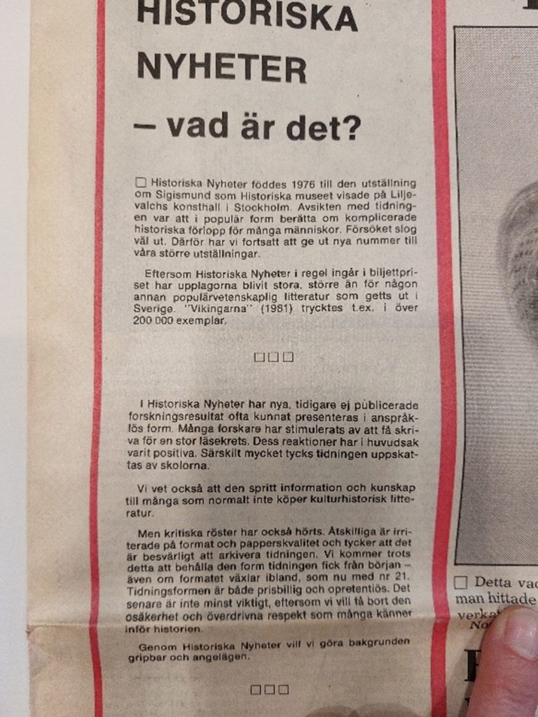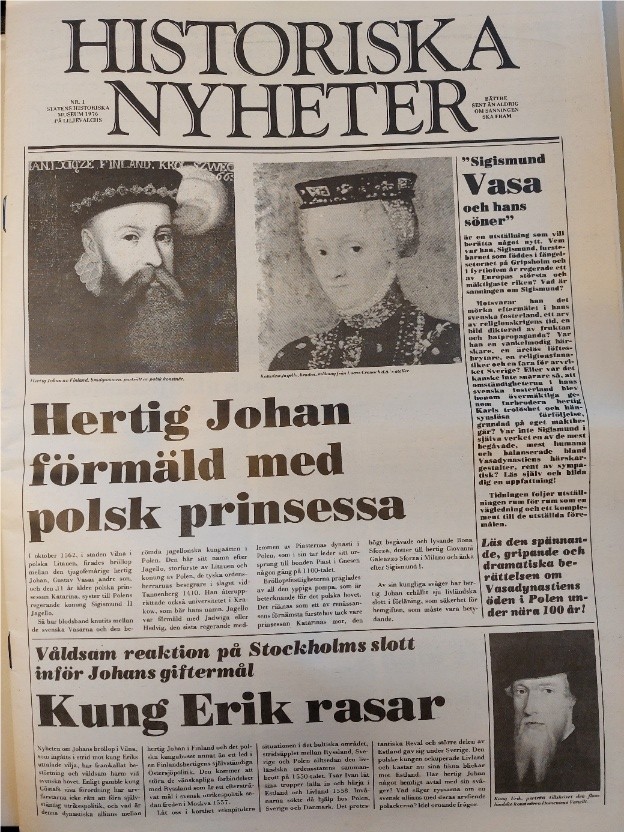 Det allra första numret av Historiska nyheter utkom i samband med utställningen ”Sigismund Vasa och hans söner” på Liljevalchs konsthall 1976. Utställningen skildrade Vasadynastin i Polen 1587-1668 och blev en stor succé. Den visades först på slottskomplexet Wawel i Kraków innan den kom till Sverige. Historiska museet med museichefen Olov Isaksson var huvudansvariga för utställningen här i Stockholm och Aron Andersson som var medeltidsexpert och avdelningsdirektör på Historiska museet var kommissarie och katalogredaktör. Historiska museets utställningschef Eric Sörling var utställningsarkitekt.